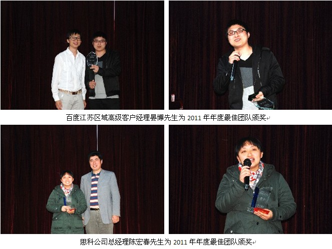 2012年4月17日下午4點,鹽城思科客服部2011年度總結(jié)表彰活動在公司大會議室隆重召開,本次活動對2011年度的優(yōu)秀團隊及個人分別進行了表彰。百度江蘇區(qū)域高級客服經(jīng)理晏博及區(qū)域客服經(jīng)理張同二位領導也出席了本次活動,更加使所有員工充分體會到了這份榮譽的來之不易。