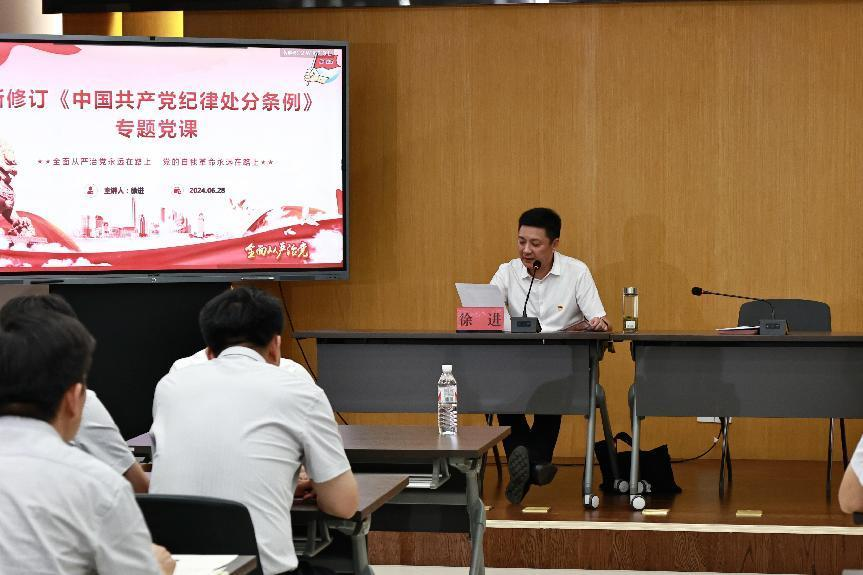 為慶祝中國共產(chǎn)黨成立103周年,弘揚偉大建黨精神,進一步強化黨員的紀律意識和規(guī)矩意識,6月28日,財金集團黨支部書記、副總經(jīng)理徐進以“新修訂《中國共產(chǎn)黨紀律處分條例》”為主題,為黨員干部講專題黨課,持續(xù)推進黨紀教育走深走實、入腦入心、見行見效。徐進同志從深刻認識修訂《條例》的重要意義、準確把握《條例》修訂